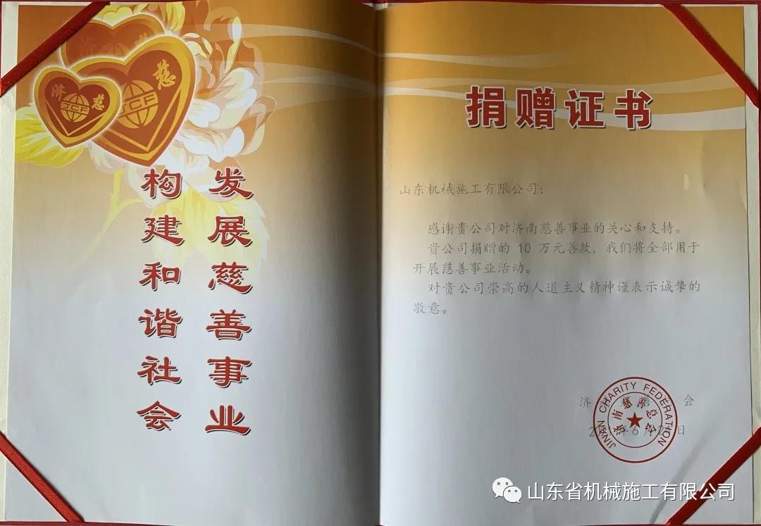 山東機(jī)施作為成立60多年的本地企業(yè),在發(fā)展壯大的同時(shí),不忘回饋社會(huì),在沈繽董事長(zhǎng)的帶領(lǐng)下,常年致力于公益事業(yè),愛心善舉遍及山東各地,覆蓋了扶貧濟(jì)困、捐資助學(xué)、扶殘助殘、疫情防控等各個(gè)領(lǐng)域,捐款捐物累計(jì)近百萬(wàn)元,用實(shí)際行動(dòng)詮釋企業(yè)的大愛精神。