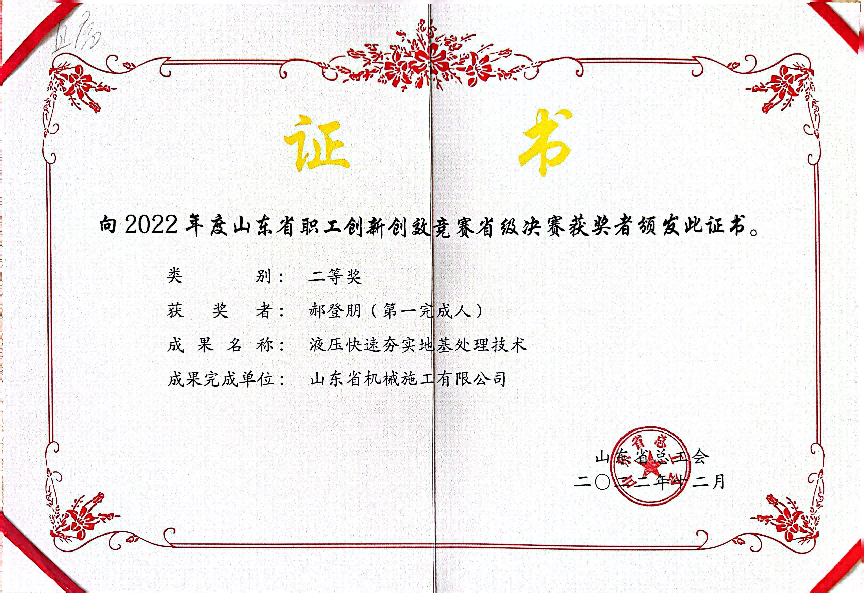 近日,山東省機械施工有限公司的創(chuàng)新技術《液壓快速夯實地基處理技術》被濟南市總工會直屬工會推薦為“全省職工優(yōu)秀創(chuàng)新成果入庫孵化轉化集中行動”入庫項目。