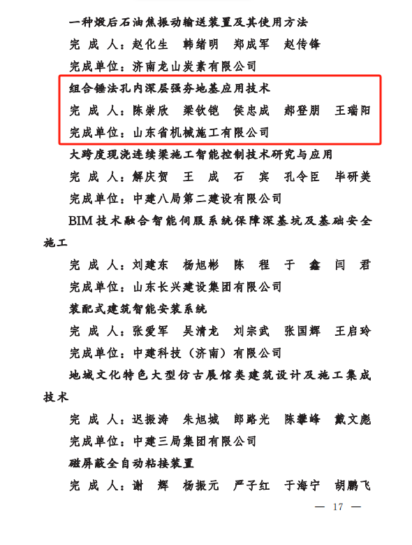 11月29日,濟南市總工會公布2023年度泉城職工全員創(chuàng)新創(chuàng)效競賽結果,我公司研發(fā)的“組合錘法孔內(nèi)深層強夯地基應用技術”被評為濟南市職工優(yōu)秀技術創(chuàng)新成果二等獎。