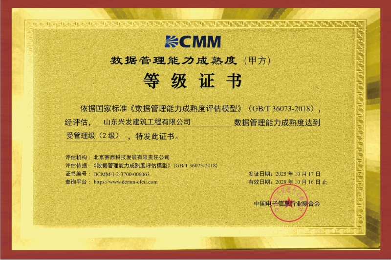 【喜訊】山東省機械施工有限公司(山東興發(fā)建筑工程有限公司)成功斬獲數(shù)據(jù)管理能力成熟度(DCMM)2級認(rèn)證!
